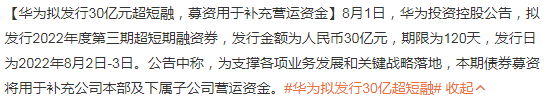 根据华为8月初发布的消息,拟发行2022年度第三期超短期融资券,金额为30亿元。这已经是华为今年来第七次募资行动,累计募资额度高达240亿元。