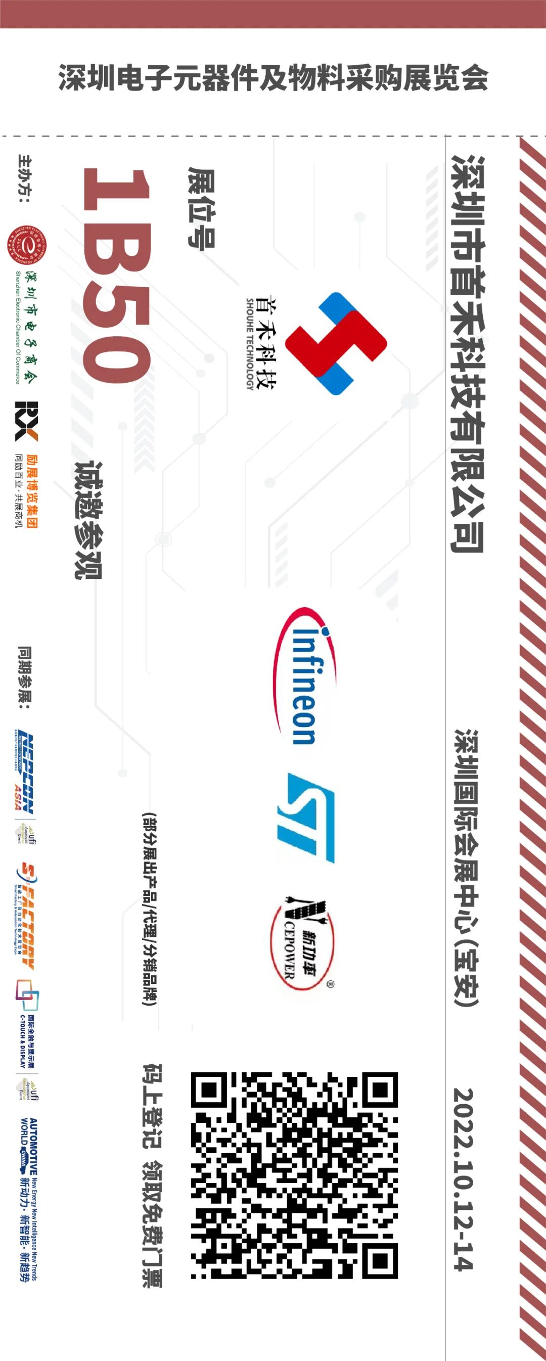 2022 深圳电子元器件及物料采购展览会,将于10月12-14日在深圳国际会展中心(宝安)闪亮登场,隆重开幕。深圳市首禾科技有限公司期待您的到来,展位号1B50,赶紧收下此邀请函,码上登记,我们不见不散!