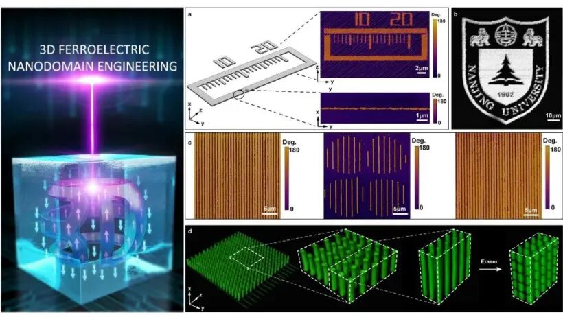 科研团队发明了一种新型“非互易飞秒激光极化铁电畴”技术,将飞秒脉冲激光聚焦于材料“铌酸锂”的晶体内部,通过控制激光移动的方向,在晶体内部形成有效电场,实现三维结构的直写和擦除。