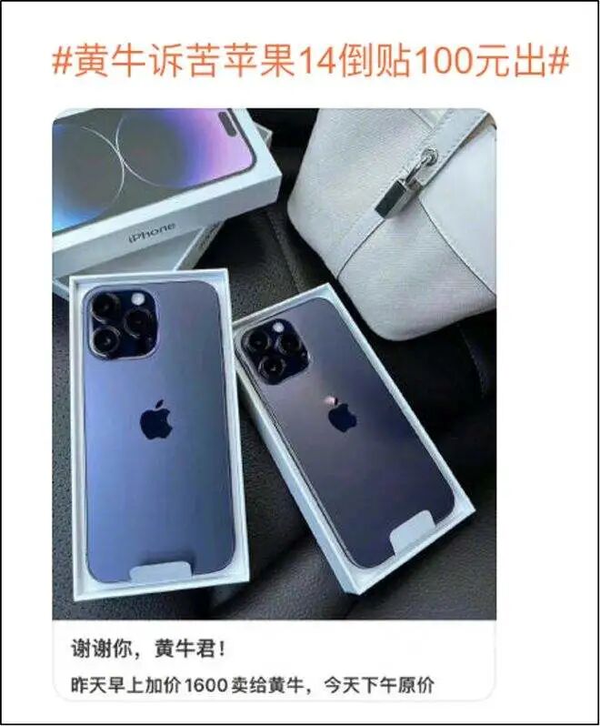 原因是这次的iPhone14不好卖,很多黄牛加价从用户手中买手机,以为可以加价卖出去,割点韭菜,赚点差价,谁知道,最后还要倒贴钱卖给另外的用户。