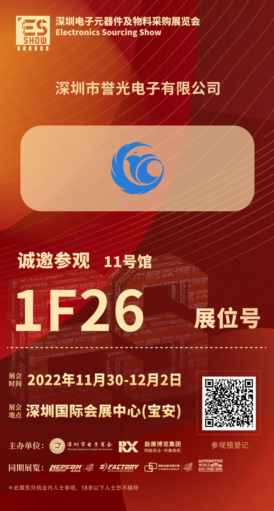2022 深圳电子元器件及物料采购展览会,将于11月30-12月2日在深圳国际会展中心(宝安)闪亮登场,隆重开幕。深圳市誉光电子科技有限公司期待您的到来,11号馆1F26 展位,赶紧收下此邀请函,码上登记,我们不见不散!