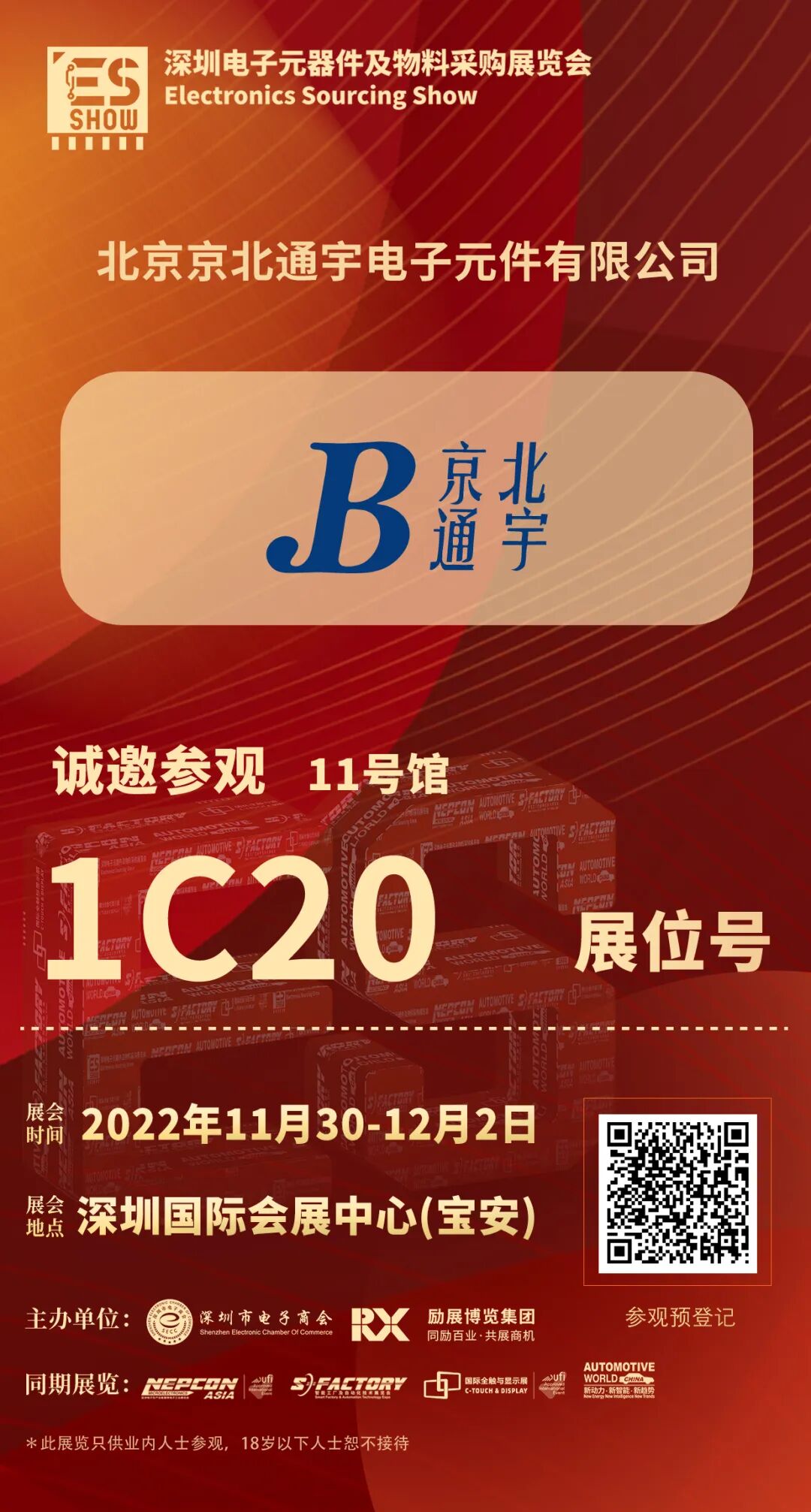 2022 深圳电子元器件及物料采购展览会,将于11月30-12月2日在深圳国际会展中心(宝安)闪亮登场,隆重开幕。北京京北通宇电子元件有限公司期待您的到来,11号馆 1C20 展位,赶紧收下此邀请函,码上登记,我们不见不散!