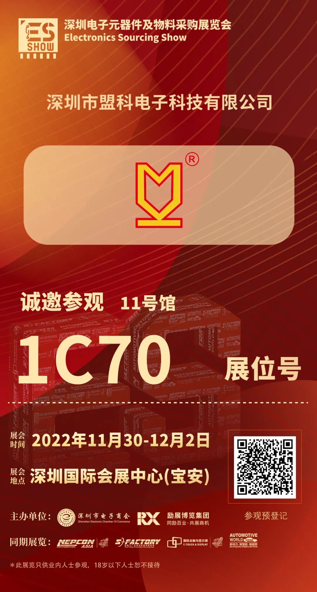 2022 深圳电子元器件及物料采购展览会,将于11月30-12月2日在深圳国际会展中心(宝安)闪亮登场,隆重开幕。深圳市盟科电子科技有限公司期待您的到来,11号馆 1C70 展位,赶紧收下此邀请函,码上登记,我们不见不散!