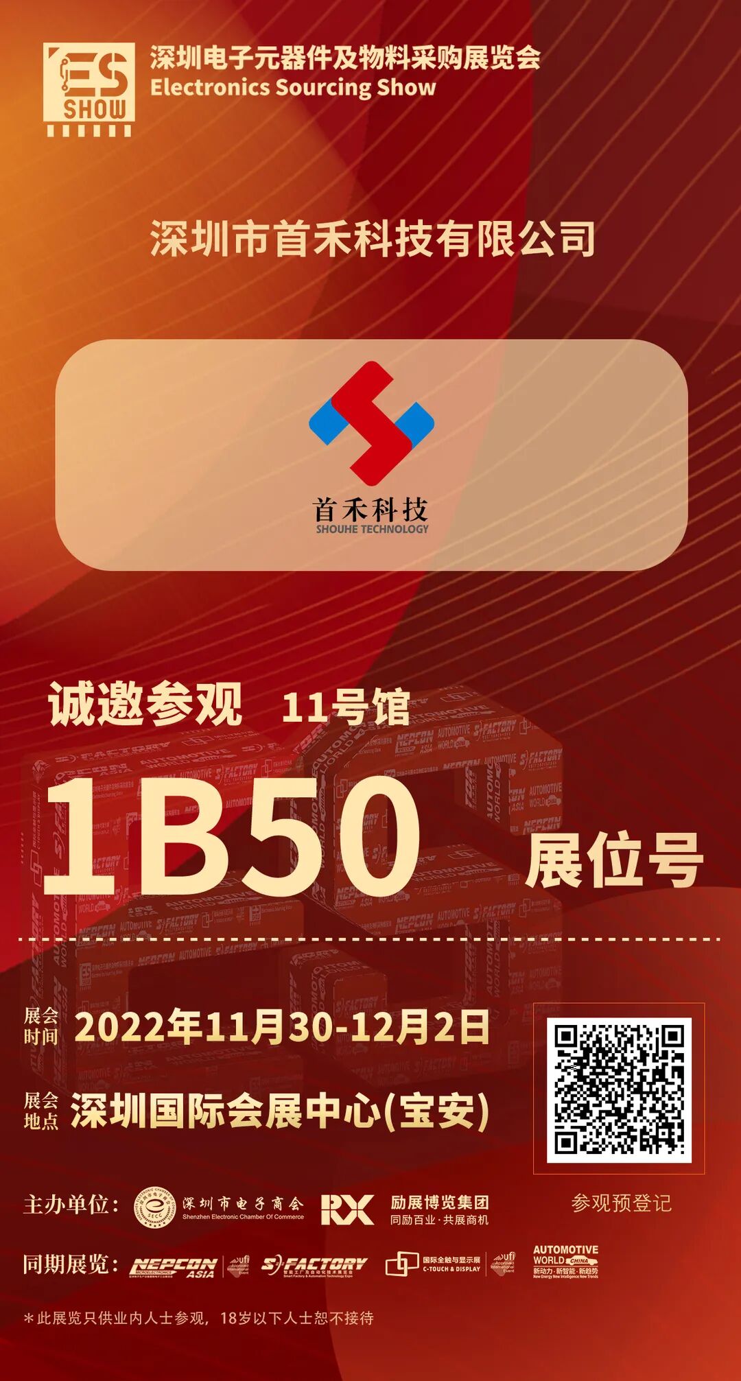 2022 深圳电子元器件及物料采购展览会,将于11月30-12月2日在深圳国际会展中心(宝安)闪亮登场,隆重开幕。深圳市首禾科技有限公司期待您的到来,11号馆B50展位,赶紧收下此邀请函,码上登记,我们不见不散!