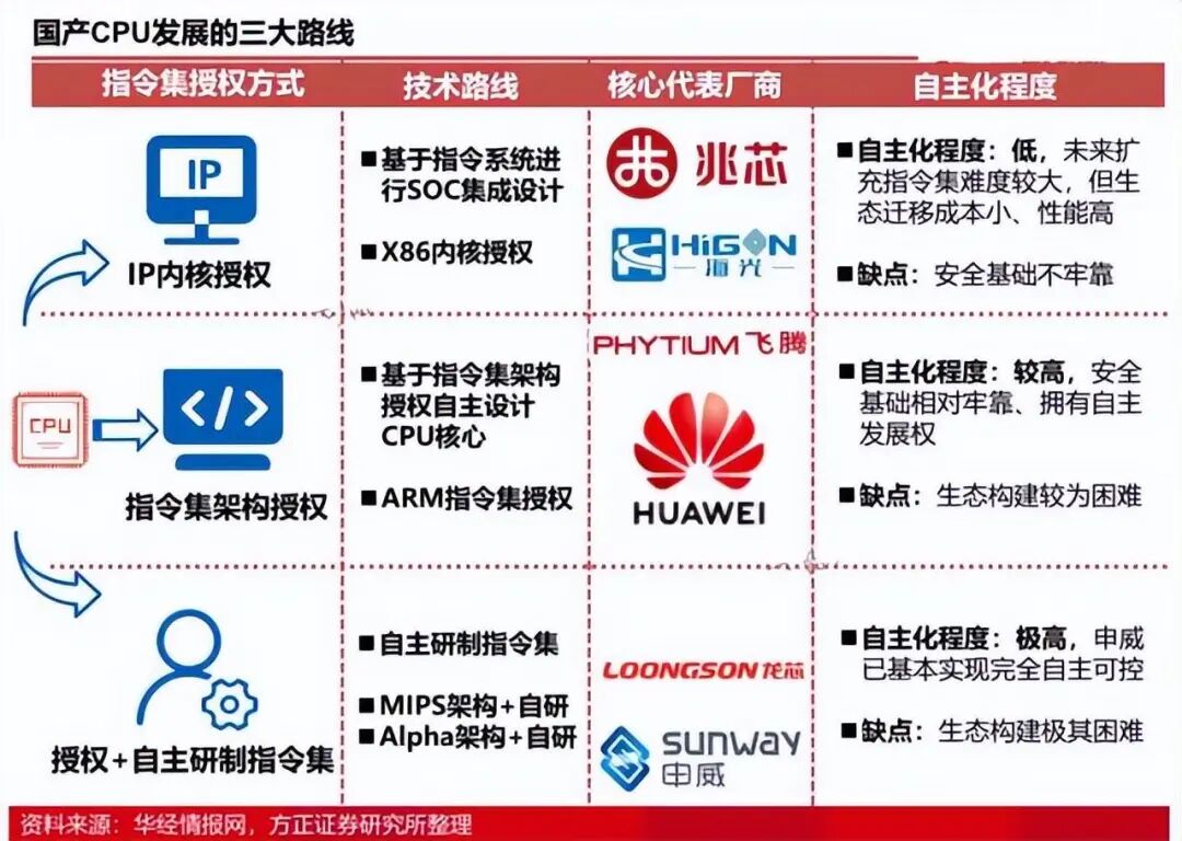 众所周知,目前有6大国产CPU,分别是华为鲲鹏、龙芯、兆芯、海光、飞腾、申威。而这6大国产CPU,走了三条路线。