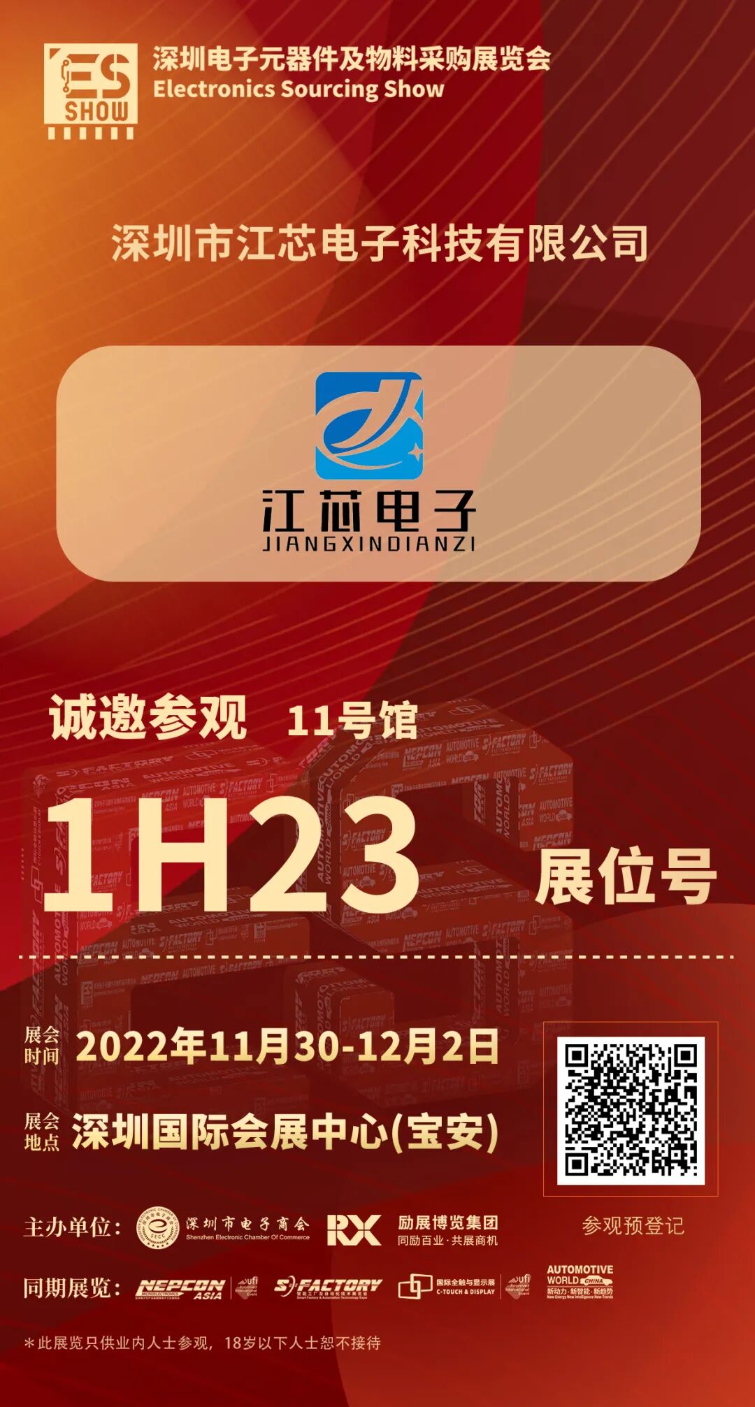 2022 深圳电子元器件及物料采购展览会,将于11月30日-12月2日在深圳国际会展中心(宝安)闪亮登场,隆重开幕。深圳市江芯电子科技有限公司期待您的到来,11号馆1H23展位,赶紧收下此邀请函,码上登记,我们不见不散!