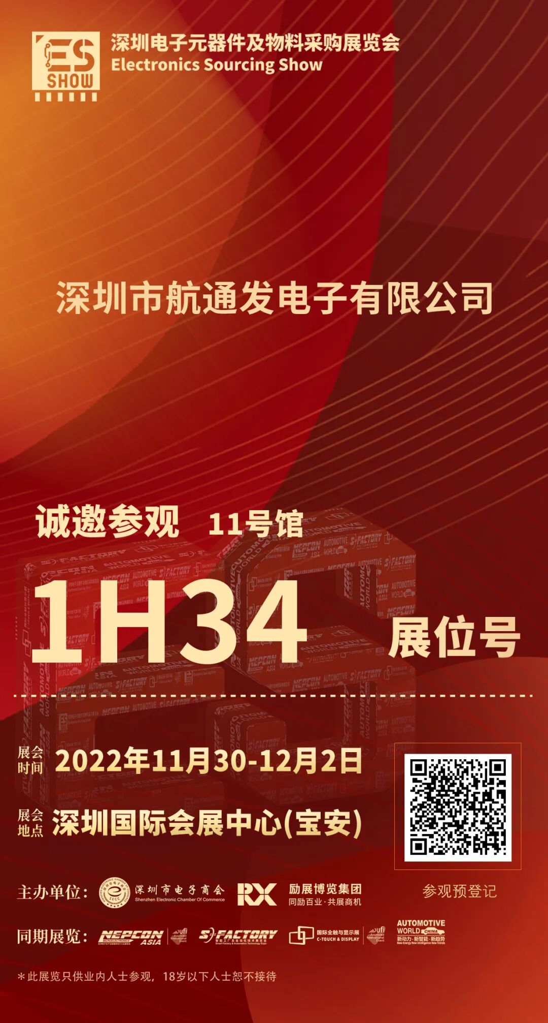 2022 深圳电子元器件及物料采购展览会,将于11月30日-12月2日在深圳国际会展中心(宝安)闪亮登场,隆重开幕。深圳市航通发电子有限公司期待您的到来,11号馆1H34展位,赶紧收下此邀请函,码上登记,我们不见不散!