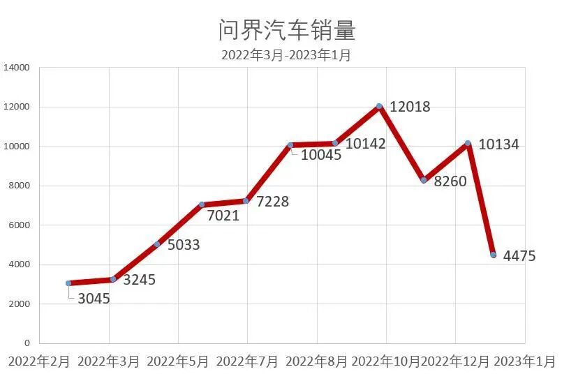 而被称为2022年新能源车企最大黑马、华为与赛力斯深度合作的AITO问界,1月份交付量达到4475辆,同比增长449.1%,但环比也跌了55.9%。