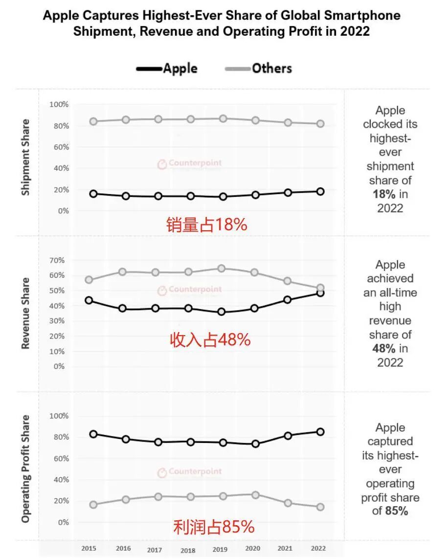 另外苹果还在 2022 年实现了有史以来最高的全球智能手机份额,高达18.8%。同时苹果一家拿走了全球智能手机所有收入的48%,所有利润 的85%,均创下史上最高纪录。