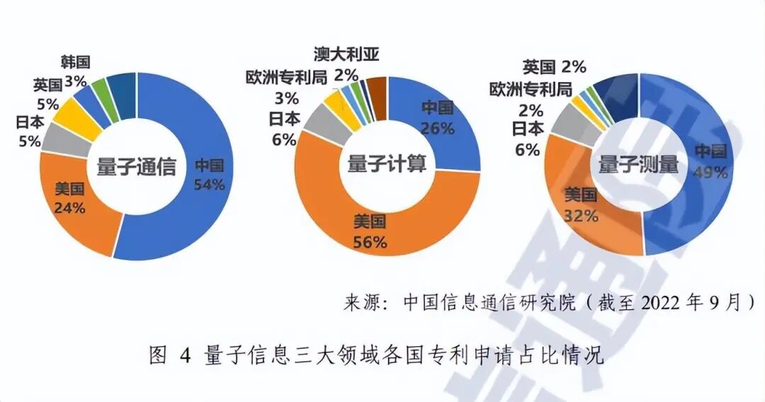 如上图所示,这是信通院统计的,截止至2022年9月份,这三大方向的专利申请情况及排名,大家可以看到,在量子计算方面,美国最牛,一家独占56%的专利,中国排第二,比例约为26%,另外的都相差太远,不足为虑。