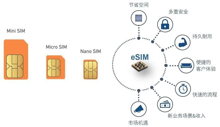 但大家都清楚,后来苹果还不满足,又推动行业推出了eSIM卡,就是手机不需要再插入一张外部的SIM卡了。手机厂商在手机中内置一块eSIM芯片,运营商将卡号信息写进去即可。