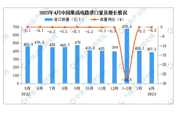 而近日,海关的数据出来,4月份中国集成电路进口量387.2亿个,同比下降0.2%,集成电路进口金额27074.8百万美元,同比下降0.2%。