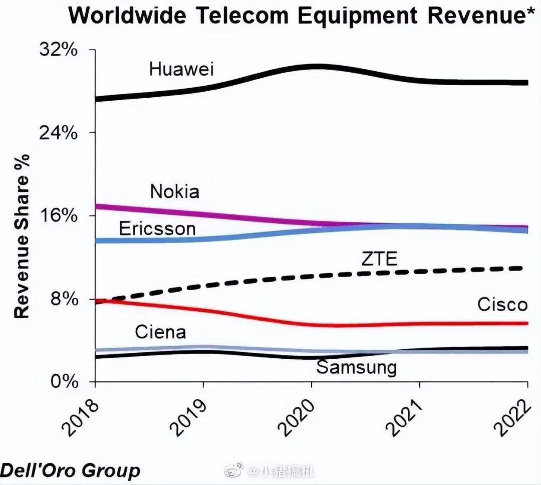 同时中国的另外一家通信设备厂商中兴的份额,一直在持续增长,与诺基亚、爱立信的差距缩小了。