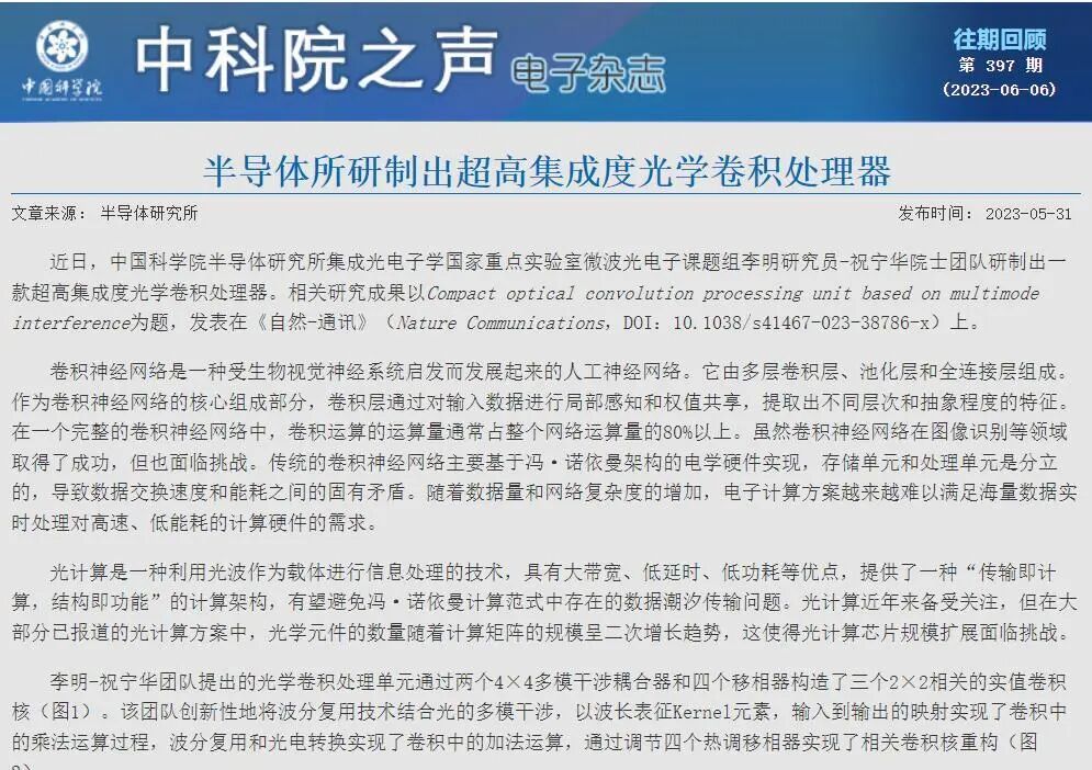而近日,中科院传出好消息,在光芯片上有了突大突破,李明-祝宁华团队研制出了一款超高集成度光学卷积处理器,其成果也发表在《自然-通讯》上。