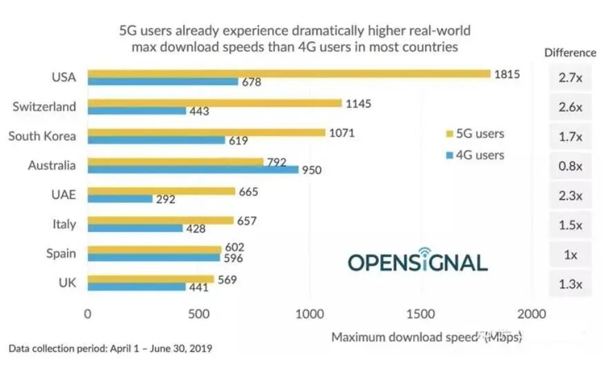 2019年6月的时候,有机构对全球的5G网速进行了测试,发现最快的美国,其5G下载速度也只有1800Mbps左右,大部分在1000Mbps以下。