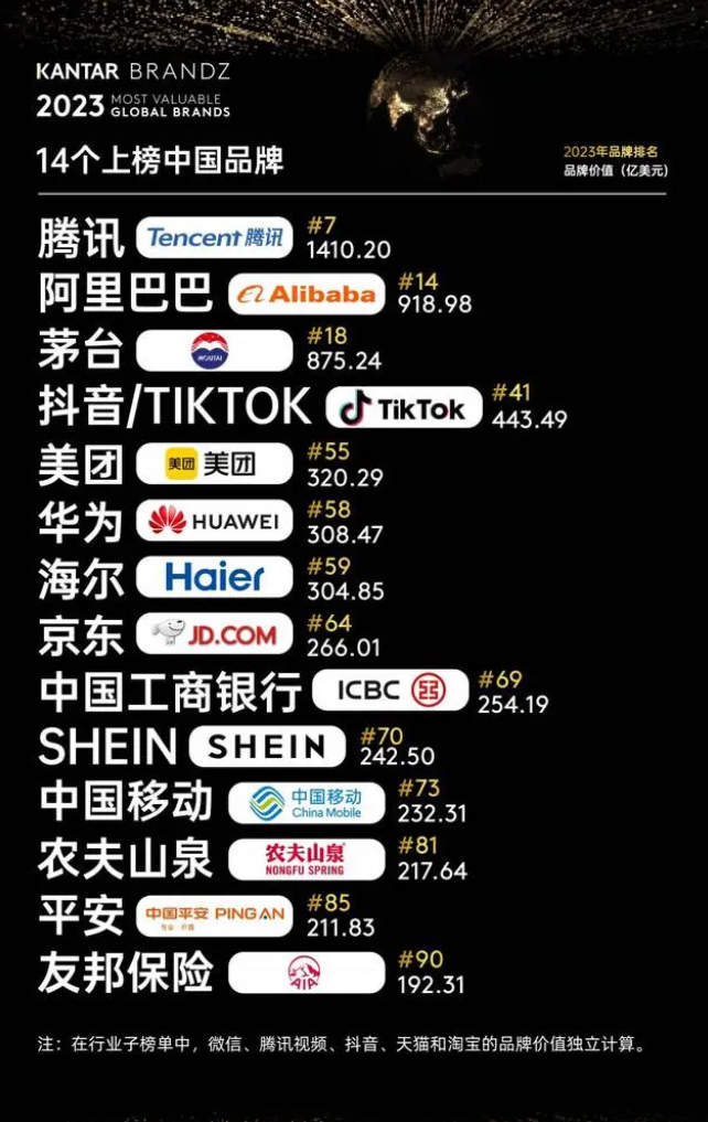而前100名中,中国一共有14家企业上榜,与去年持平,除了腾讯外,还有阿里巴巴、茅台、抖音/TikTok、美团、华为、海尔、京东、中国工商银行、SHEIN、中国移动、农夫山泉、平安、友邦保险。