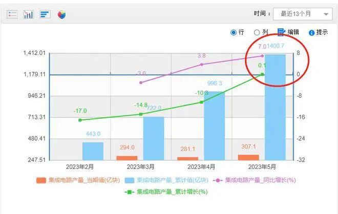 要知道从2022年1月份开始,到2023年3月份,这15个月中国芯片产量一直在同比下滑,创下了连续下滑15个月的历史记录,而4月份虽然增长,但累计值还是下滑的,但是到了5月份,累计产量都实现了正增长。