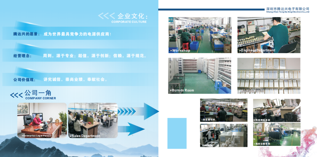 企业简介 深圳市腾达兴电子有限公司成立于2009年,位于深圳市宝安区西乡固戍三围华丰第一科技园,是集研发、生产和销售于一体的开关电源专业制造生产厂家。工厂面积约4千平方米,现有200多位训练有素的公司员工、经验丰富的研发团队和管理队伍。健全的管理品质体系,并配置了先进的测试仪器设备。产品外观设计新颖,公司所生产的产品完全符合ROHS、REACH、PAHS,SCCP等相应环保要求,2016年获 得了ISO9001体系认证。 在产品研发方面,公司拥有由10来名技术工程师组成的工程技术研发中心,开发有: 5W,12W,18W,24W,36W,48W, 60W,72W,90W,120W,150W等系列机型,并取得了UL、GS、CCC、PSE、BS、CE、CB、FCC、EMC等国际安规机构认证。产品符合国际最新六级能源之星标准。品质与交期是公司发展的灵魂。公司一方面引进了国际先进的检测设备,采用了国际 一流的质量管理体系,经过严格的考评和筛选,选定了多家极具实力的优秀元器件材料供应商,并严格把控生产制程及成品出库质量关;另一方面投巨资完成现代化绿色制造体系升级,配备先进的无尘防静电车间,引进无铅波峰焊等现代化生产设备,所有 员工均按ISO体系认证标准培训上岗;月均产能超过50万台,可快速响应来自全球的订单需求。 在营销方面,公司立足中国,放眼全球,营销网络遍布亚洲、欧洲、美洲等市场。十年来,我们以“进入市场无先后”的基点,坚持以“科技以人为本,做最适合用户的电源产品为基础,多元并举,跨越发展”的发展策略,秉承“以信誉为生命,以产品为先导,以质量为依托,以服务为保证,以价格为杠杆,以利润为中心”的营销理念,用一种坚强的信念和毅力树立了腾达兴的产品声誉和企业形象,在同行业树一道靓丽迷人的风景线。 来源于企业