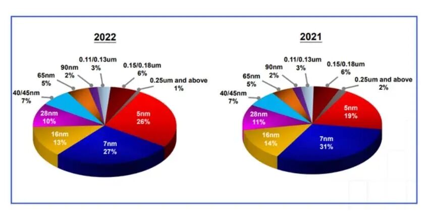 台积电在2022年,一共采用了288种制程工艺,为全球532家客户代工了12698款产品。但其中5nm占比高达26%,7nm占比高达27%。而2021年时,5nm为19%,7nm为31%。