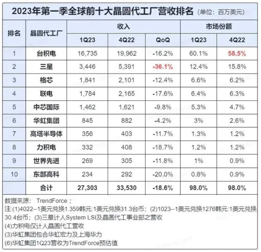 按照机构的排名数据,2023年一季度前六大芯片代工厂商,分别是台积电、三星、格芯、联电、中芯国际、华虹集团。