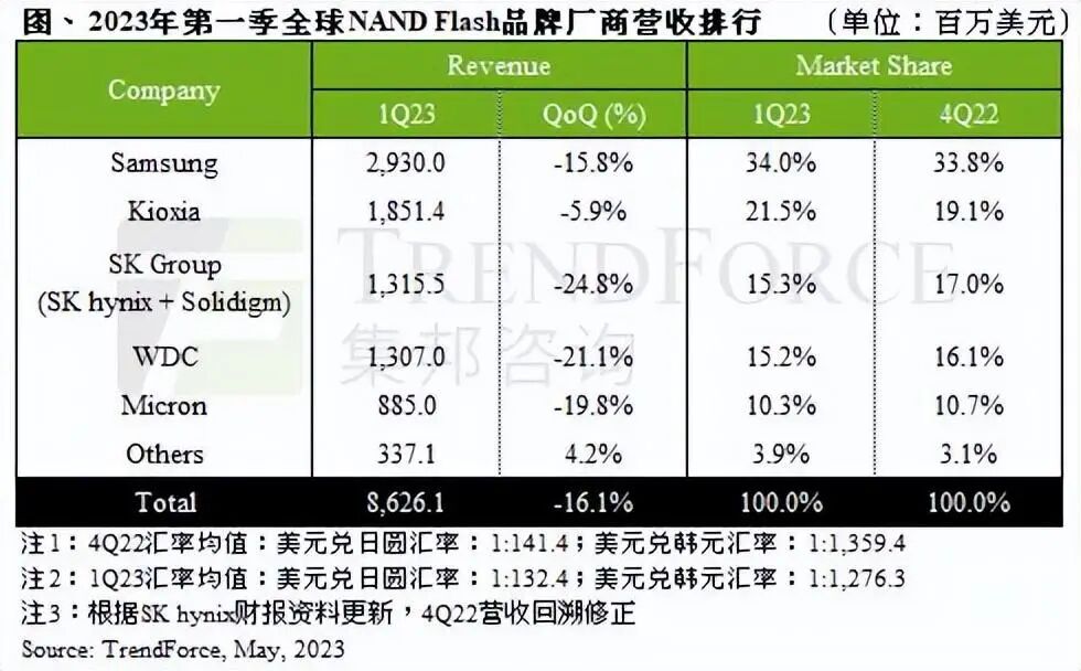 我们以NAND闪存芯片为例,来说明一下这个问题,按照TrendForce发布的最新数据,一季度全球 NAND 闪存产业营收约为 86.3 亿美元(约 613.59 亿元人民币)。
