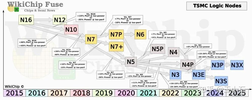 2015年台积电量产了16nm工艺,然后2017年量产了10nm工艺,2018年量产了7nm工艺,2019年的时候,量产了N7+,N7P等7nm增强的工艺。