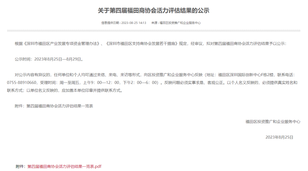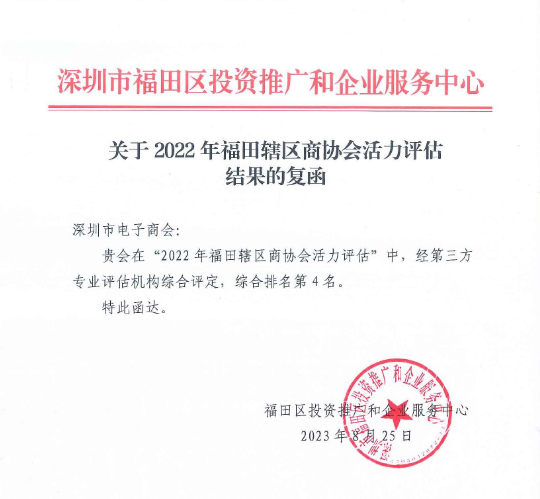 从福田区投资推广和企业服务中心获悉,深圳市电子商会在“2022年福田辖区商协会活力评估”中,经第三方专业评估机构综合评定,综合排名第4名。
