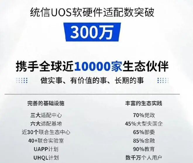 而近日,国产知名操作系统正式官宣了好消息,知名系统厂商统信UOS发文表示,统信 UOS 软硬件适配数现已突破 300 万。