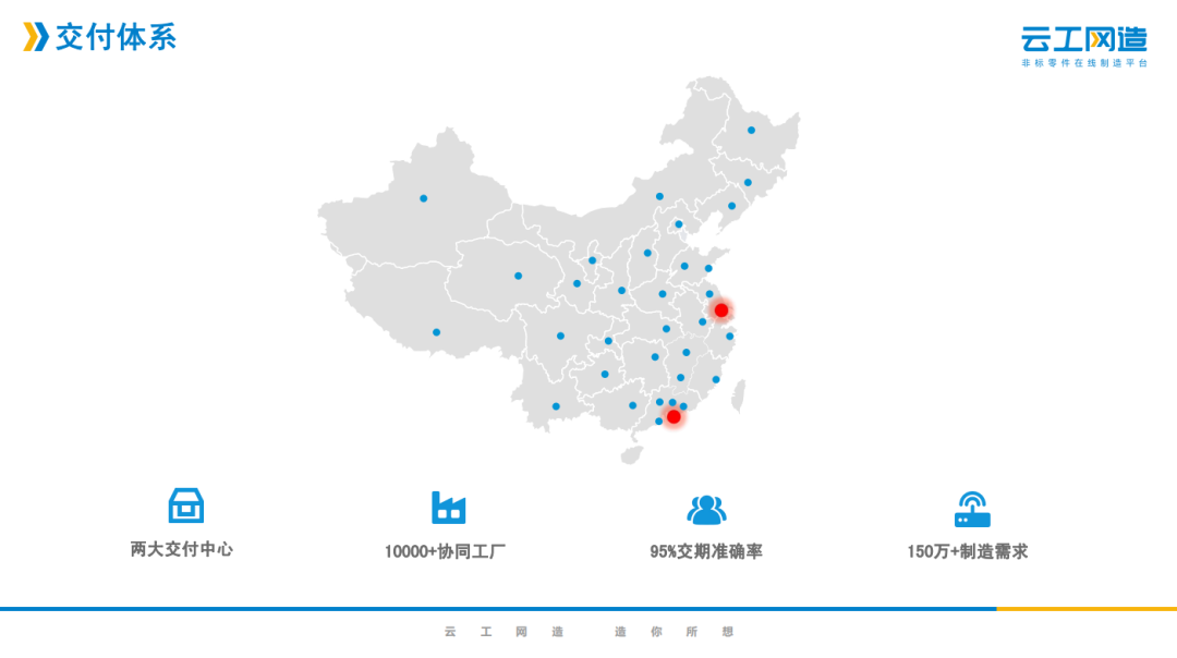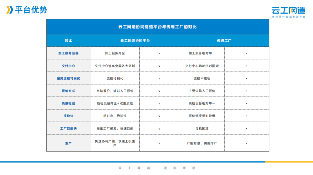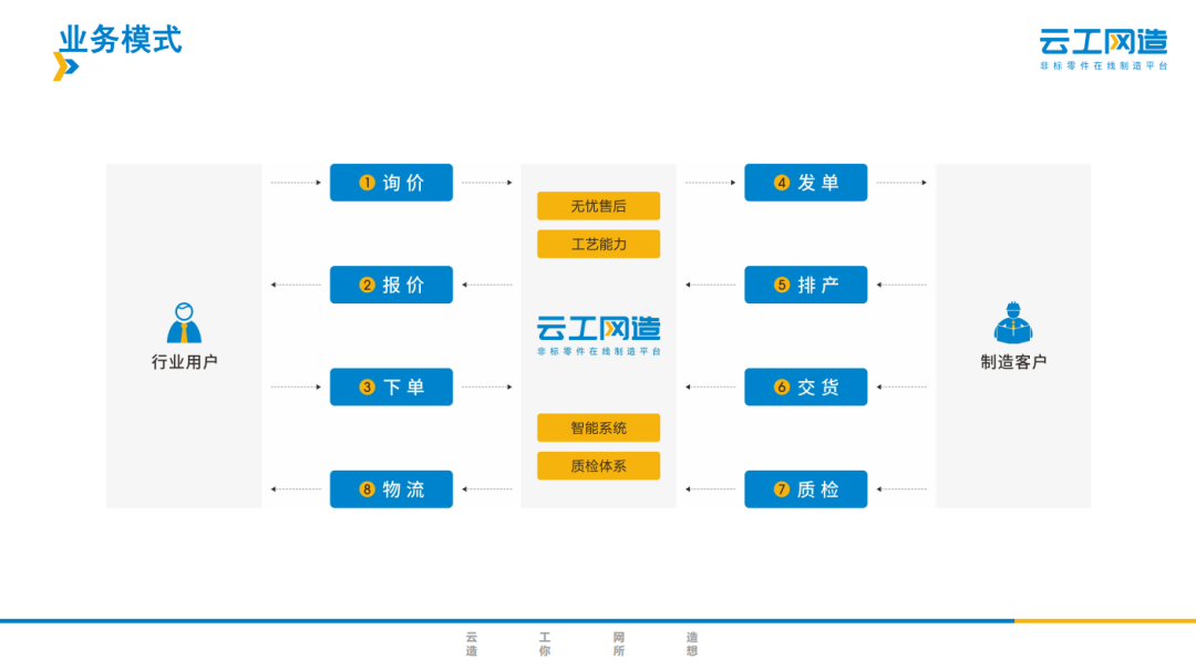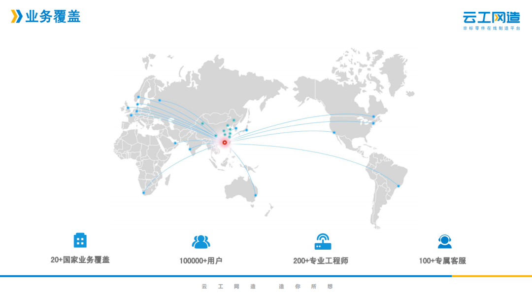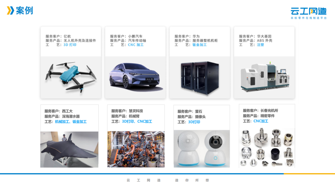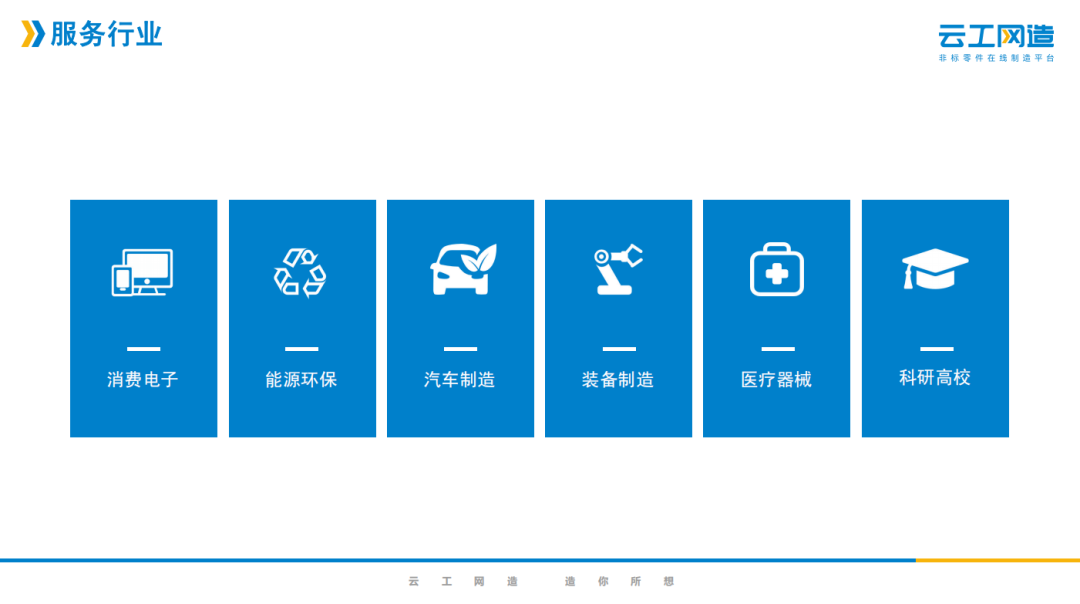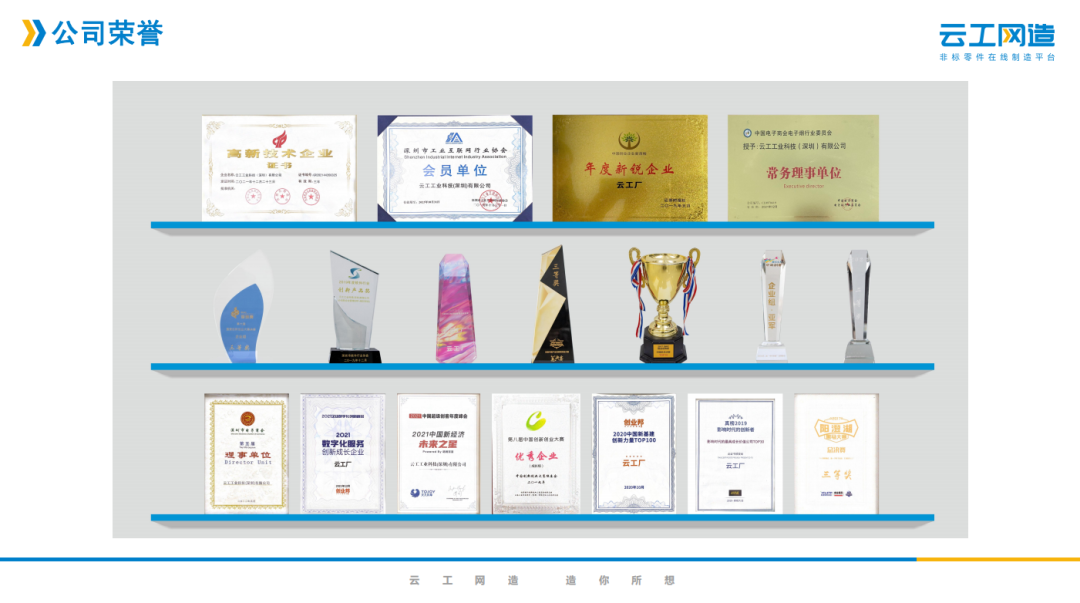 企业简介 深圳云工网络科技有限公司,是在线制造的开创者,致力于成为非标零部件制造领域的亚马逊。云工集团先后获得4轮风险投资,股东方 包括富士康,中国科学院和多家上市公司。 针对制造行业普遍存在的信息严重不对称、产能浪费及营销成本高昂等痛点,云工集团开创了零件和整机在线制造的工业互联网新模式, 利用先进的算法技术,独创的智能报价系统和遍布全球的自营+加盟制造产能,在线让客户以前所未有的体验完成报价、询盘和下单,在 全球首次实现了非标结构零部件“1分钟报价,1小时上机”,在后端连接了上万家工厂和十几万台设备,把制造从图纸到产品的全流程 在线化。 业务电话:卢厚春  13410455528 资料来源于企业