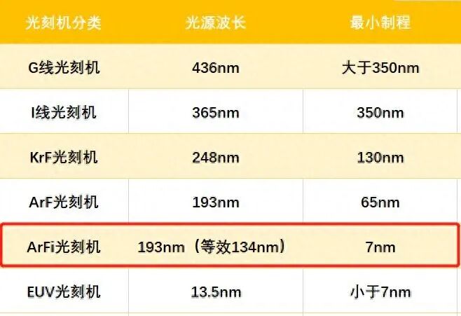 为何会这么分呢?原因是这6种光刻机,采用不同波长的光源,然后可以制造的芯片工艺也不一样,如下图所示,一看大家就都懂的。