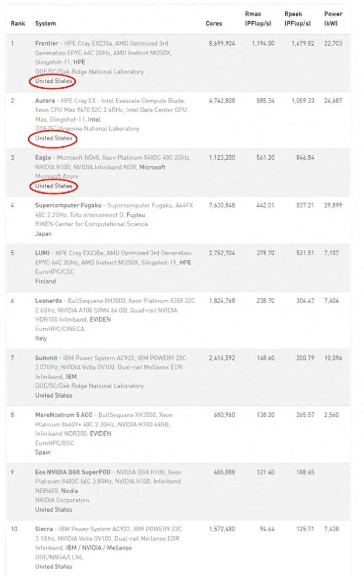 最新超级计算机排名:美国霸榜前3,垄断前10,中国跌出前10