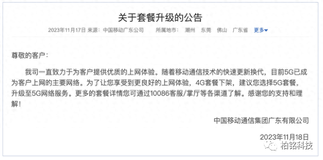 就在某运营商固网宽带断网促使用户掏钱买光猫而引发舆论汹汹之际,界面快讯报道指广东移动也来凑热闹,发布公告指4G套餐下架,建议用户选择5G套餐,升级至5G网络。