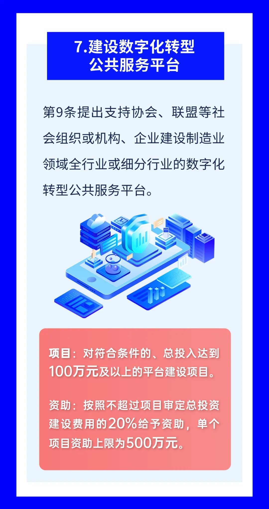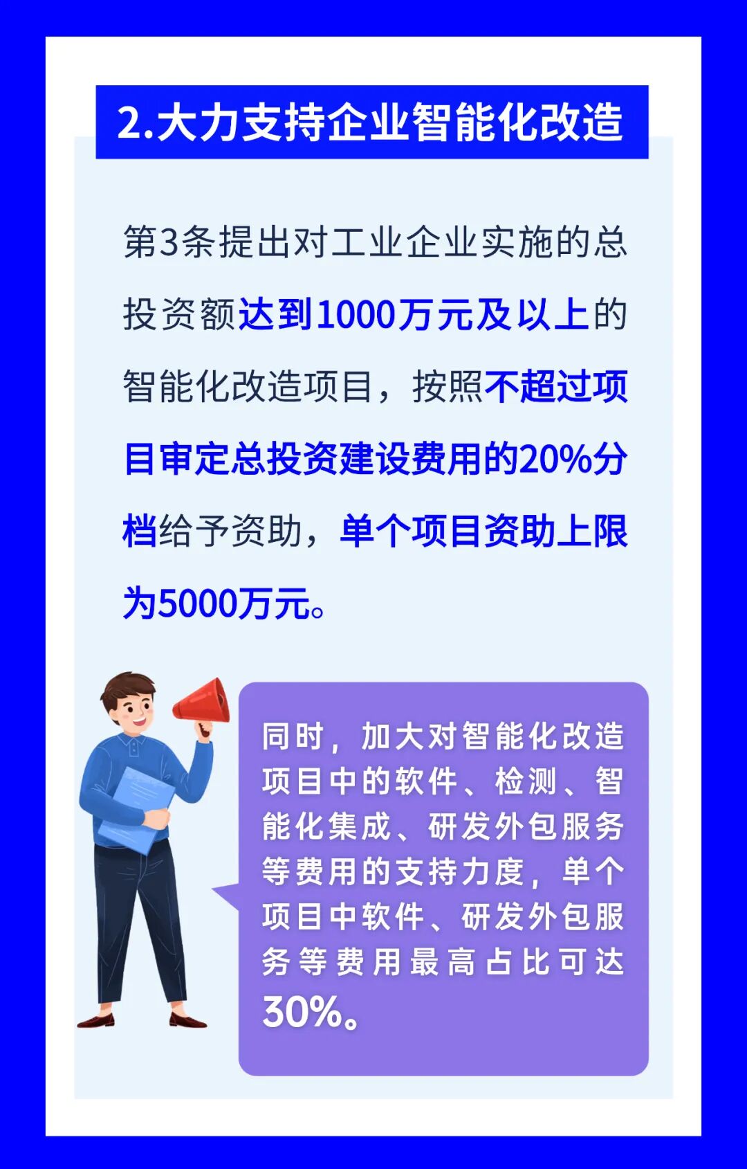 深圳市关于新形势下 加快工业企业 技术改造升级的若干措施 为深入贯彻中央及省委、市委关于加快推进新型工业化和工业企业技术改造的工作部署,充分发挥技术改造在稳增长、调结构、促转型中的重要作用,引导企业以高端化、智能化、绿色化、融合化为主攻方向实施技术改造,结合我市实际制定本措施。 一、加大技改项目投资支持 1.推动落地一批重大技术改造项目。以更大力度吸引有新增投资意向的工业企业在深布局落地一批优质产能、重点项目,推动企业增资扩产、提质发展,对工业企业在深实施的总投资额达到 5 亿元及以上的重大技术改造项目,按照不超过项目审定总投资建设费用的 10%给予资助,单个项目资助上限为 1 亿元。〔责任单位:市工业和信息化局、市发展改革委,各区政府(大鹏新区、深汕特别合作区管委会)。以下均需各区政府(大鹏新区、深汕特别合作区管委会)负责,不再列出〕 2.鼓励企业加大设备更新力度。支持工业企业围绕扩大产能规模、提升生产效率、提高产品质量、促进技术装备和产品更新换代、改善生产环境等方面加大技术改造投入,采用先进、成熟、适用的技术设备,淘汰老旧设备,对总投资额达到 2000 万元及以上的技术改造项目,按照不超过项目审定总投资建设费用的 10%给予资助,单个项目资助上限为 1000 万元。(责任单位:市工业和信息化局、市发展改革委) 3.大力支持企业智能化改造。鼓励企业积极部署高档数控机床、工业机器人、智能传感与控制等智能制造装备,加大对5G、互联网、大数据、物联网、人工智能等新一代信息技术的应用力度,对企业产品设计、技术开发、生产工序、加工制造、仓储配送、售后服务等生产经营管理活动,进行全流程的数字化、网络化、智能化改造,对工业企业实施的总投资额达到 1000 万元及以上的智能化改造项目,按照不超过项目审定总投资建设费用的 20%分档给予资助,单个项目资助上限为 5000 万元。加大对智能化改造项目中的软件、检测、智能化集成、研发外包服务等费用的支持力度,单个项目中软件、研发外包服务等费用最高占比可达 30%。(责任单位:市工业和信息化局) 4.深化工业互联网创新应用。支持工业企业开展工业互联网技术集成应用实现生产模式创新,推进 5G 技术集成运用于生产各环节,打造一批工业互联网标杆示范项目和 5G 工厂,对总投资额达到 500 万元及以上的工业互联网创新应用项目,按照不超过项目审定总投资建设费用的 30%给予资助,单个项目资助上限为 500 万元。(责任单位:市工业和信息化局) 5.推进传统优势产业数字化转型。支持服装、家具、黄金珠宝、钟表、皮革、内衣、眼镜、工艺美术、化妆品等传统优势产业企业运用智能制造装备和数字技术,实施研发设计、生产制造、供应链管理、营销和销售、售后服务、人才培养等关键环节的数字化转型,对符合条件的、总投资额达到 100 万元及以上的传统优势产业企业数字化转型项目,按照不超过项目审定数字化转型费用的 20%给予资助,单个项目资助上限为 500 万元。(责任单位:市工业和信息化局) 6.积极引导企业绿色化改造。推动工业企业全方位绿色化转型,对重点用能单位实施节能降碳绿色化改造,实现年节能量50 吨标准煤以上,或减少碳排放 150 吨以上,或单位产品能耗达到国家标杆水平的技术改造项目以及重点行业企业实施的工业固体废物资源化利用改造项目,按照不超过项目审定总投资建设费用的 30%给予资助,单个项目资助上限为 1000 万元。(责任单位:市工业和信息化局、市发展改革委) 7.深化先进制造业和现代服务业融合发展。支持制造业企业利用新一代信息技术,围绕工业设计服务、总集成总承包、定制化服务、全生命周期管理、节能环保服务、供应链管理、共享制造、检验检测认证服务等方向融合化发展,对制造业企业实施的总投资额达到 1000 万元及以上的符合条件的“两业”融合示范发展项目,按照不超过项目审定总投资建设费用的 20%给予资助,单个项目资助上限为 1000 万元。(责任单位:市工业和信息化局、市发展改革委) 二、培育一批公共服务平台和应用示范标杆 8.培育一批工业互联网示范平台。推动综合型、行业级、专业型平台协同发展,支持制造业企业和服务商建设、提升工业互联网平台,按照不超过项目审定总投资建设费用的 30%给予资助,单个项目资助上限为 1000 万元。培育一批具备综合集成能力的工业互联网服务商,按照不超过项目审定总投资建设费用的30%给予资助,单个项目资助上限为 300 万元。支持举办工业互联网重大活动,按照不超过项目审定总投入费用的 30%给予资助,单个项目资助上限为 300 万元。(责任单位:市工业和信息化局) 9.建设数字化转型公共服务平台。支持协会、联盟等社会组织或机构、企业建设制造业领域全行业或细分行业的数字化转型公共服务平台,提供数字化转型咨询诊断、数字化人才培训、技术交流、资源数据共享、产品体验、线上直播展销推广、工业设计赋能、标准验证与检测、融资等数字化转型方面基础支撑服务,对符合条件的、总投入达到 100 万元及以上的平台建设项目,按照不超过项目审定总投资建设费用的 20%给予资助,单个项目资助上限为 500 万元。依托龙头骨干企业和重大科研机构建设公共技术服务平台,向中小企业开