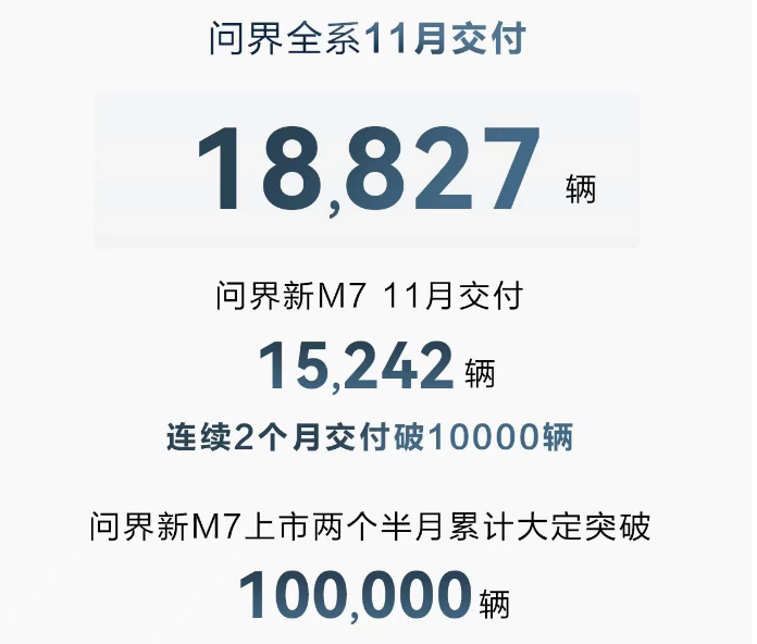 如下图所示,这1.8827万辆中,新问界M7销量为15242辆,说明M5的销量大约为3000多辆。