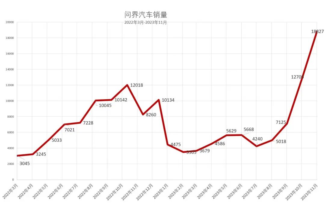 可见,在沉寂了一年时间之后,随着M7的改款,问界又成为了大黑马,这个过程堪称真正的过山车,从高到低,再到创新高,下图是问界自去年3月份上市,到2023年11月份的销量曲线。