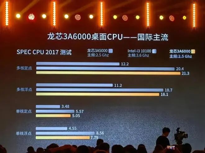 但到2023年推出的龙芯3A6000,与第10代四核酷睿性能相当,相当于只落后了3年左右了。