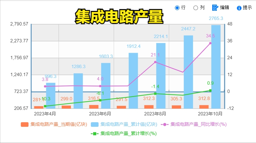 接着看国内芯片生产量,10月份,集成电路产量为312.8亿块,同比大增34.5%创下几年以来的新高,而1-10月份,国内累计生产集成电路2765.3亿块,和去年相比,已经同比增长了0.9%。