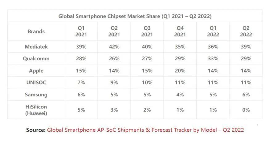 上图是华为海思从2021年1季度至2022年2季度的情况,可以看到自去年2季度开始,海思的份额就变为0了,然后这一年多以来,一直就是0。