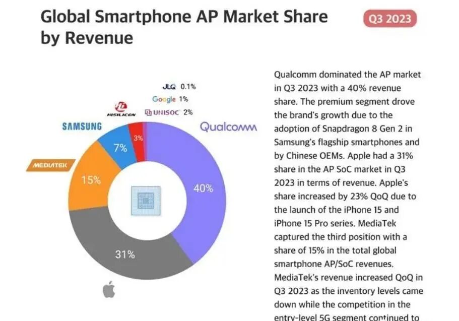 三是华为麒麟芯片的市场份额暴增,如上图所示,这是机构显示的2023年3季度,全球手机AP市场份额情况。