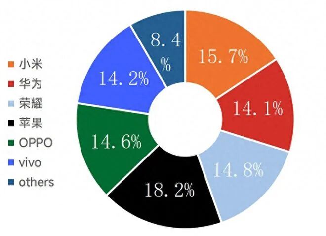 数据如下,国内市场的份额排名情况为苹果、小米、荣耀、OPPO、VIVO、华为。