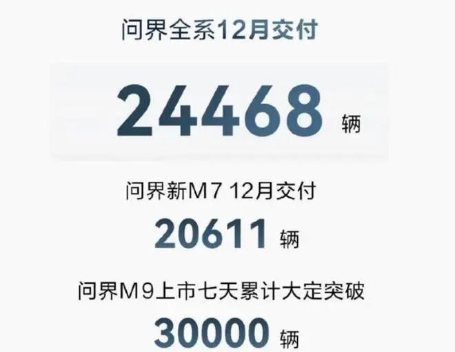 这24458辆中,问界新 M7 为20611 辆,全年累计交付达 48552 辆,另外问界还表示称,问界 M9 上市七天累计大定已突破 30000 辆。