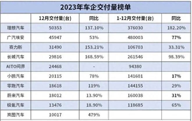 另外的这些车企,则都是交付没超过2万的,零跑、蔚来、极氪、岚图的交付量是1万多,其中值得提的是岚图,12月交付量达到了10017,同比增长479%,这也是岚图首次交付量超过1万辆。