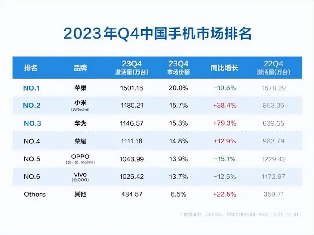 近日,知名机构发布了2023年4季度国内手机市场激活数据,如下图所示,苹果激活量1501.16万台、小米激活量1180.21万台、华为激活量1146.57万台,这三大品牌分列第一、二、三名。