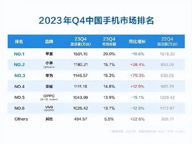 如下图所示,这是机构统计的2023年四季度,国内手机排名情况,可以看到小米高居第二名,成为了国产手机中的老大,仅次于苹果。