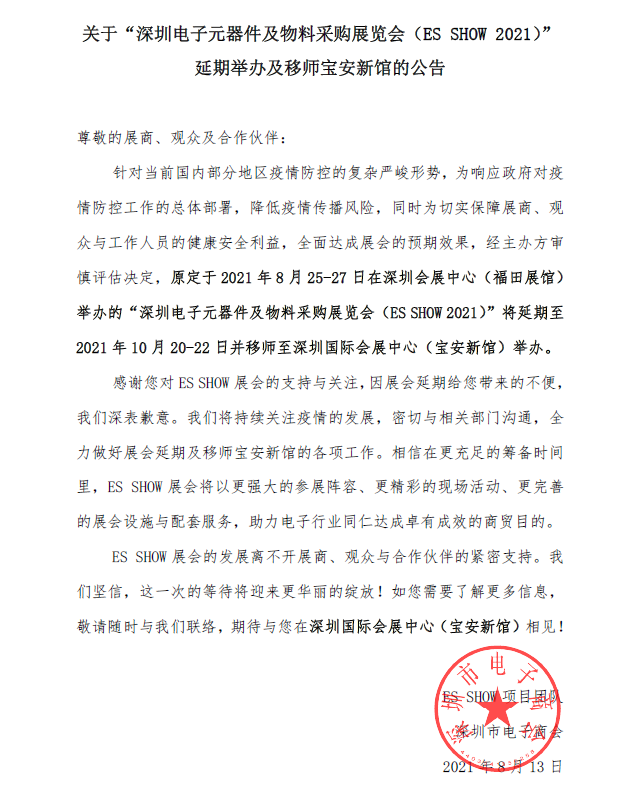关于“深圳电子元器件及物料采购展览会(ES SHOW 2021)” 延期举办及移师宝安新馆的公告 2021 尊敬的展商、观众及合作伙伴: 针对当前国内部分地区疫情防控的复杂严峻形势,为响应政府对疫情防控工作的总体部署,降低疫情传播风险,同时为切实保障展商、观众与工作人员的健康安全利益,全面达成展会的预期效果,经主办方审慎评估决定,原定于2021年8月25-27日在深圳会展中心(福田展馆)举办的“深圳电子元器件及物料采购展览会(ES SHOW 2021)”将延期至2021年10月20-22日并移师至深圳国际会展中心(宝安新馆)举办。 感谢您对ES SHOW展会的支持与关注,因展会延期给您带来的不便,我们深表歉意。我们将持续关注疫情的发展,密切与相关部门沟通,全力做好展会延期及移师宝安新馆的各项工作。相信在更充足的筹备时间里,ES SHOW展会将以更强大的参展阵容、更精彩的现场活动、更完善的展会设施与配套服务,助力电子行业同仁达成卓有成效的商贸目的。 ES SHOW展会的发展离不开展商、观众与合作伙伴的紧密支持。我们坚信,这一次的等待将迎来更华丽的绽放!如您需要了解更多信息,敬请随时与我们联络,期待与您在深圳国际会展中心(宝安新馆)相见! ES SHOW 项目团队 深圳市电子商会 2021年8月13日