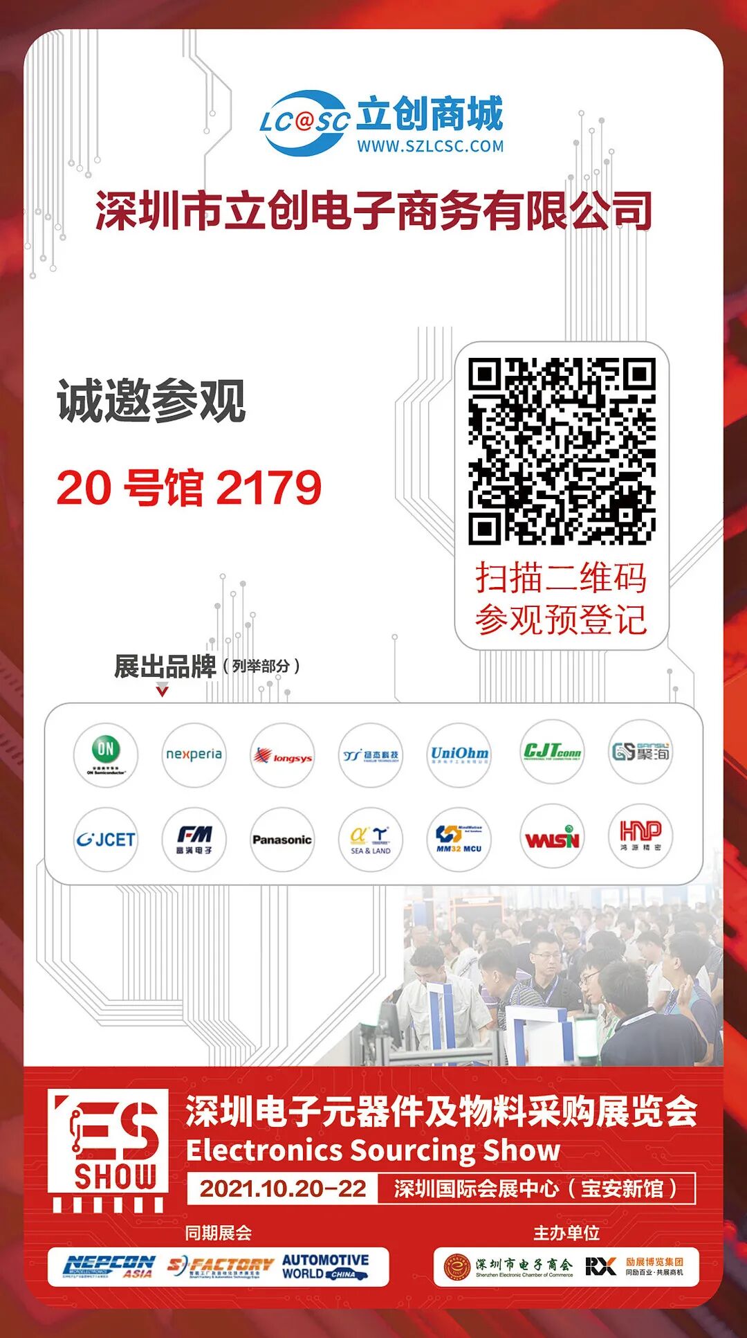 深圳市立创电子商务有限公司 深圳市立创电子商务有限公司,简称立创商城(WWW.SZLCSC.COM),在短短10年内,已经发展成为领先的现货元器件交易平台。目前,平台拥有近2000家品牌供应商、超过40万种现货SKU,拥有广东和江苏超过70,000平米智能化仓储,海内外注册用户超200万,单日订单突破7500个。立创商城基于持续的商品能力、物流基础设施和大数据化IT系统建设,率先在业内建立了强大的现货交付能力,满足客户“正品、现货、一站式”的需求。 参展品牌: 参展产品: 应用领域: 消费电子、汽车电子、手机、家电、工业控制、新能源等 码上登记 2021 深圳电子元器件及物料采购展览会,将于10月20-22日在深圳国际会展中心(宝安)闪亮登场,隆重开幕。深圳市立创电子商务有限公司期待你的到来,展位号2179,赶紧收下此邀请函,码上登记,我们不见不散! 坐稳!码上启程,搭乘开往ES SHOW 2021的列车!