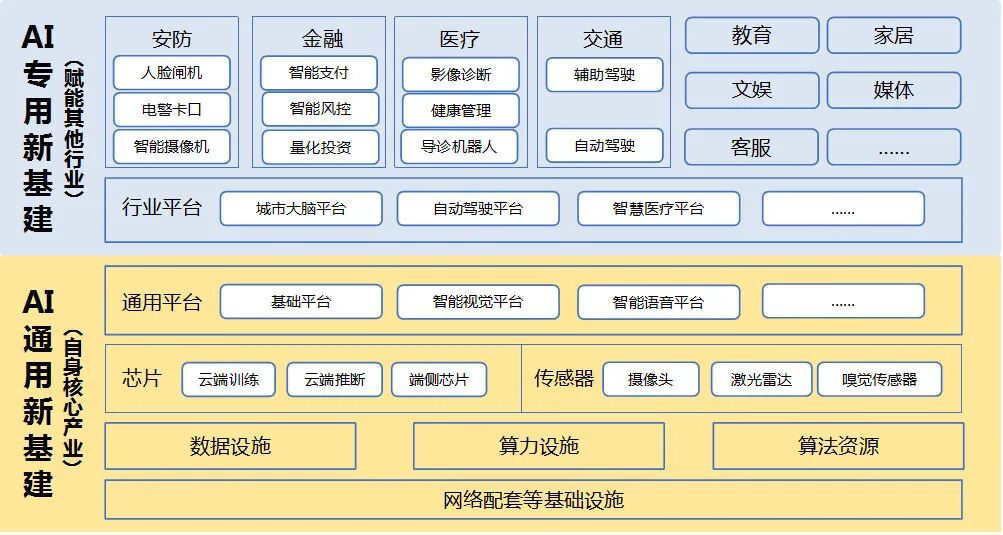 一、“AI新基建”基础设施的两层次属性 人工智能的基础设施属性。“新基建”七大领域中,人工智能是新一轮产业变革的核心驱动力,具有很强的“头雁”效应。人工智能新基建,作为数字经济重要的基础设施,天然的基础性、公共性和外部性,广泛赋能各行业,使得其变得越来越基础设施化。 “AI新基建”的两个层次。从产业自身发展及赋能其他行业角度,我们认为“AI新基建”可分为“AI通用新基建”和“AI专用新基建”两个层次。“AI通用新基建”主要指,人工智能自身核心产业的技术创新和发展,可面向全行业全领域提供通用的AI能力;“AI专用新基建”主要指,人工智能赋能其他产业,可面向特定行业特定领域提供专用AI能力。两者共同作用,作为传统经济数字化的引擎,为各行业提供人工智能基础支持。 图1 “AI新基建”产业链视图 二、“AI通用新基建”聚焦助力AI发展 “AI通用新基建”的三驾马车。围绕基础设施应有之义,“AI新基建”,从数据、算力和算法三大要素展开,构成三驾马车,面向社会提供低成本、开放式、通用性人工智能技术和产品。数据是基础,是人工智能机器学习的数据资源库;算力是保障,是机器的计算能力,最直观的就是芯片,通过整合相应的软件框架,提供训练能力;算法是灵魂,是机器的学习方法,通过提供各种各样的通用算法模型,以API或SDK的方式调用,并结合具体应用场景提供特定技术接口。 “AI通用新基建”重点建设内容。数据涉及产业主要是人工智能基础数据服务市场,包括数据资源定制服务、数据集产品、数据平台建设等;算力涉及产业主要体现在人工智能上游硬件环节,包括芯片、服务器、传感器等;算法涉及主要是指一些通用的、经典的算法模型资源。整合数据、算力、算法能力,建设人工智能通用平台,包括计算机视觉、语音识别、自然语言处理,机器学习、知识图谱等典型技术,对外提供相应的AI训练能力和云端推理能力,并为AI技术的使用方提供各种接口来调用底层资源,也是“AI通用新基建”的重要内容。 “AI通用新基建”带动千亿新兴产业发展。据斯坦福大学发布的人工智能指数(AI Index),AI算力需求翻倍时间从2012年之前的2年降低到现在的3-4个月,现有AI算力远远不足以支撑人工智能发展,也必将带动人工智能自身核心产业加快发展。据赛迪顾问统计,2019年人工智能核心产业规模为1302.4亿元,增长率达到31.9%。据招商证券等预测,到2025年,人工智能相关底层硬件和通用技术及平台的基础设施投资,累计投资规模预计超2000亿元。综合各方判定,“AI通用新基建”代表的人工智能核心产业,已经催生出一个千亿的新兴市场,成为经济增长的新动能。 三、“AI专用新基建”赋能特定行业 “AI专用新基建”即是针对特定应用建设的基础性设施建设。以智慧城市为例,城市大脑便是“AI专用新基建”的重要内容。城市大脑平台通过将散布在城市各个角落的数据连接起来,利用认知、决策及优化、探索及挖掘、预测、干预等手段,实现即时分析、智慧调动、优化管理,科学研判及协同指挥。一般而言,城市大脑平台包括五大基础能力建设:足够的弹性计算能力、强大的数据整合能力、兼容的算法服务能力、广泛的感知汇聚能力、可靠的网络安全能力。基于城市大脑平台建设,推动政府数字化转型、实现政企数据双向对接与开放、支撑各类城市应用的繁荣发展,完善智慧城市建设,提升城市综合治理水平。 “AI专用新基建”应用领域广阔。通过人工智能赋能各行业,推动数字经济和实体经济融合创新,实现新旧动能的转换和产业结构优化升级,牵引巨大的行业市场。具体而言,在智慧城市、智能医疗、智能驾驶、智慧农业、智能制造、智慧金融、智能零售、智慧教育、智能机器人、智慧安防等诸多领域,人工智能都有其专用应用场景和属性。 “AI专用新基建”撬动万亿行业新市场。根据国务院《新一代人工智能发展规划的通知》规划,到2020年,我国人工智能带动相关产业规模超过1万亿元;到2025年,带动相关产业规模超5万亿元;到2030,带动相关产业规模超过10万亿元。人工智能在生产生活、社会治理各方面应用的广度深度极大拓展,极大提升传统基础设施的智能化水平,形成支撑新一代人工智能广泛应用的基础设施体系。 作为“新基建”重要支撑的人工智能,基于其先天的基础设施属性,不管是人工智能自身的核心产业还是赋能其他行业,都连接着巨大的市场,“AI新基建”成为我国数字经济时代的重要引擎和经济转型升级的极大助力,也必将在推动我国经济高质量发展过程中起到越来越重要作用。