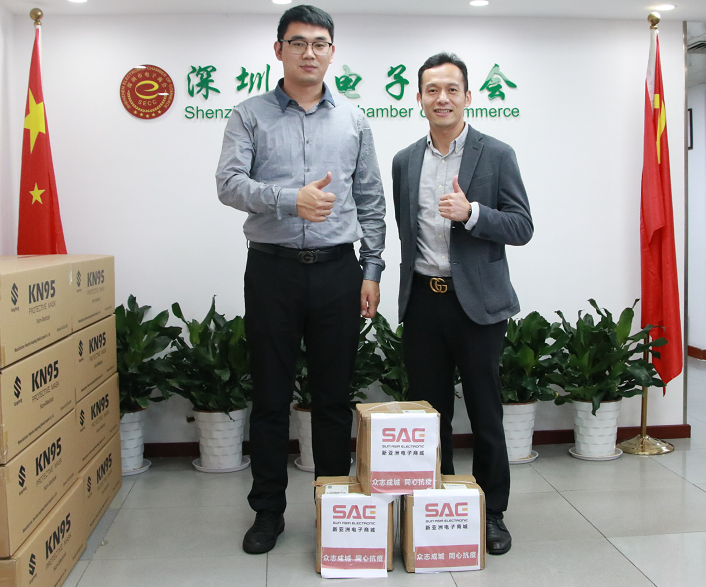 3月24日下午,副会长单位新亚洲电子商城总经理助理赖宏春代表商城为秘书处送来消毒液,姚振雷副秘书长代表秘书处接受物品,感谢副会长单位的支持,一起携手抗疫,共筑生命健康铜墙铁壁。全社会坚定决心和信心,积极响应遵守防疫措施,就能打赢这场疫情攻坚战,企业早日恢复正常生产经营,市民大众回归正常生活工作,取得疫情防控、经济建设全面胜利。
