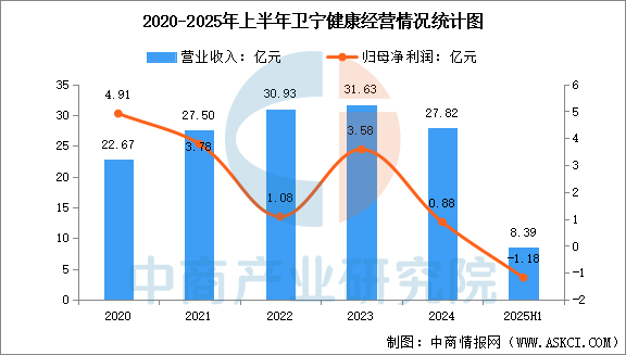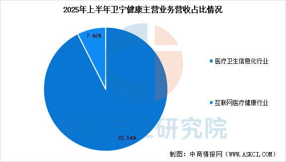 2025年上半年,卫宁健康营业总收入8.39亿元,同比下降31.43%,归母净利润亏损1.18亿元,同比减少491.04%。上半年,公司医疗卫生信息化行业收入7.765亿元,占比92.54%,互联网医疗健康行业收入6263万元,占比7.46%。