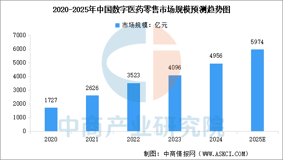数字医药零售市场已成为中国医药零售市场日益重要的一部分,涵盖医药健康用品、医疗器械和营养品等在线销售。中商产业研究院发布的《2025-2030年中国数字医疗行业市场调研及投资前景预测报告》显示,中国数字医药零售市场规模由2020年的1727亿元增至2024年的4956亿元,2020年至2024年的复合年增长率为30.15%。中商产业研究院分析师预测,2025年中国数字医药零售市场规模将达到5974亿元。